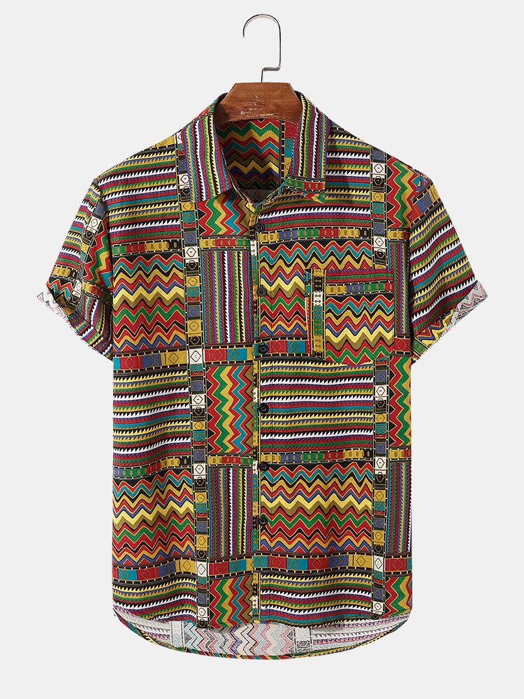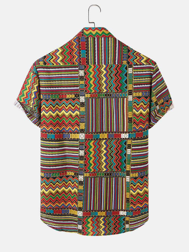 Mens Colorful Geometry Pattern Lapel Short Sleeve Tribal Shirt – Red S