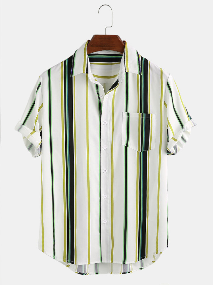 Mens Colorful Stripe Chest Pocket Short Sleeve Leisure Shirts – M Green