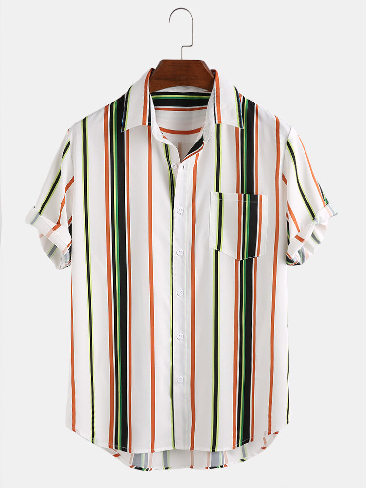 Item Type: ShirtsPattern Type: StripeGender: Men Fit Type: FitStyle: Casual,Fashion Thickness: RegularCollar: Turn Down CollarSeason: SummerDecorations: PocketMaterial: 95% Polyester,5% SpandexSleeve Length: Short SleeveColor: Red,Green,BlueCuff Type: Shirt Sleeve Occasion: Leisure,Home,Daylife Package includes