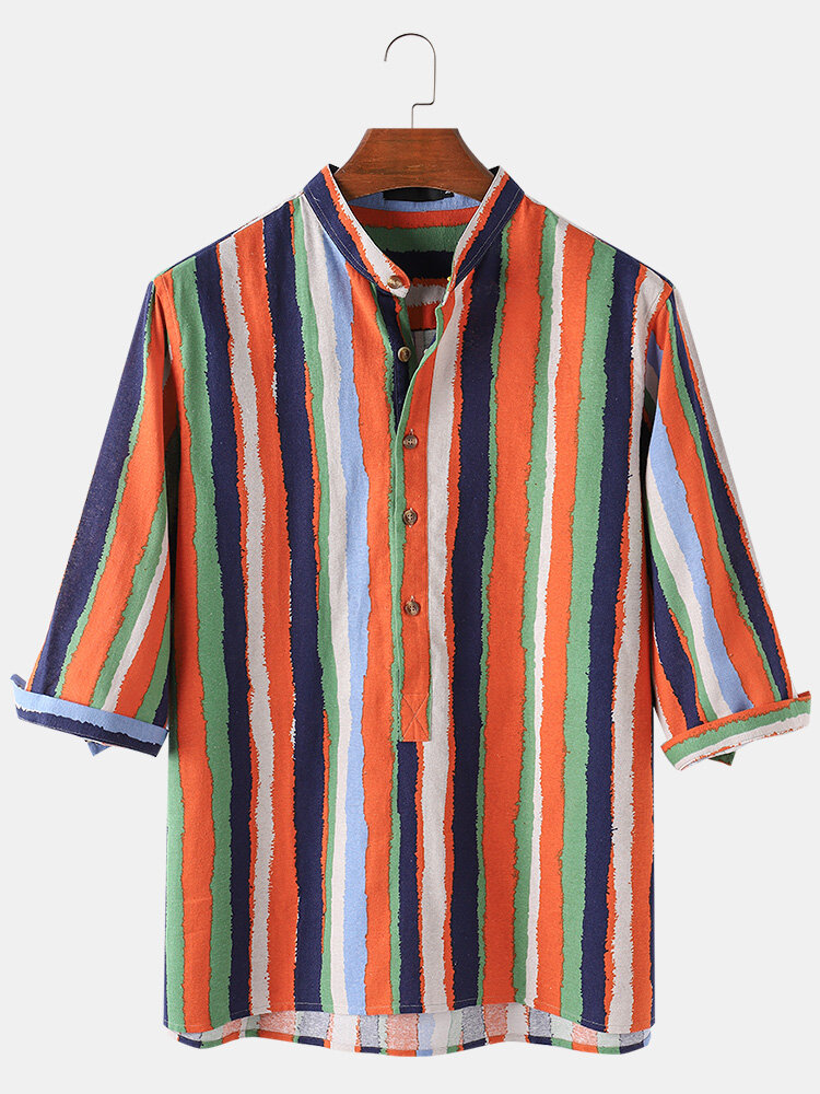 Mens Colorful Stripe Print Cotton Breathable Half Sleeve Henley Shirts – Green S