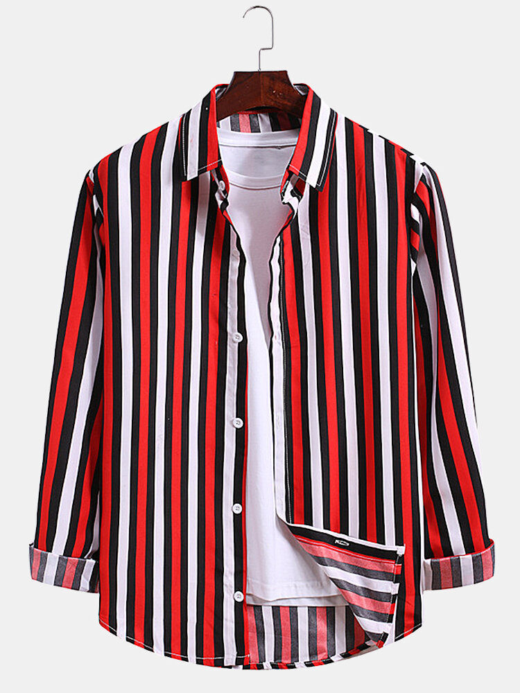 Mens Colorful Stripe Print Lapel Button Up Long Sleeve Casual Shirts – Red L
