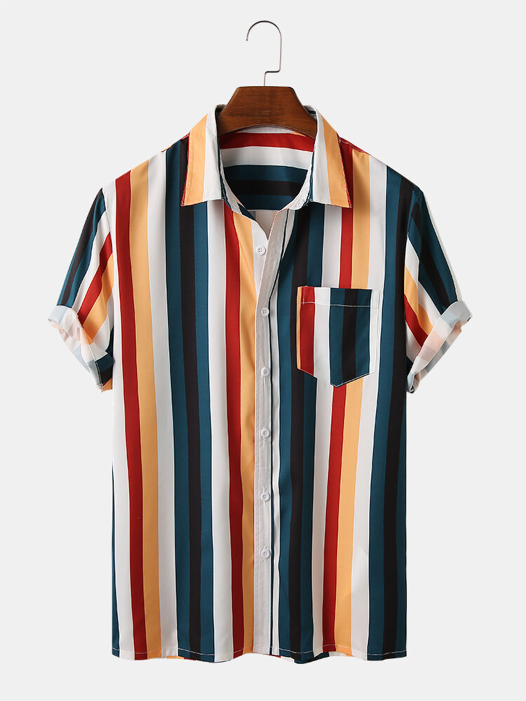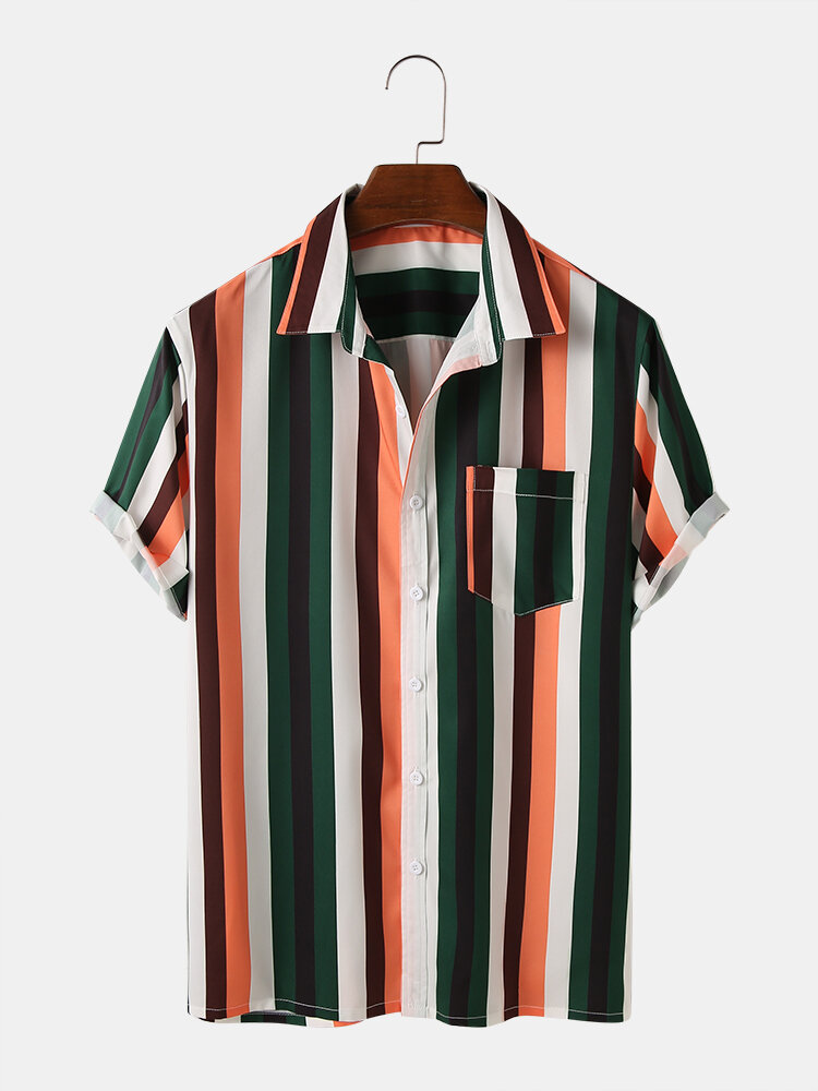 Mens Colorful Striped Turn Down Collar Short Sleeve Shirts – Green S