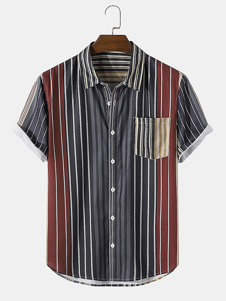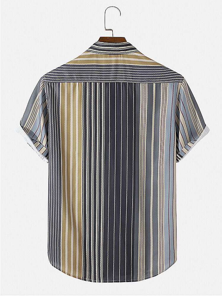 Mens Colorful Vertical Stripe Lapel Short Sleeve Shirts With Pocket – Blue S