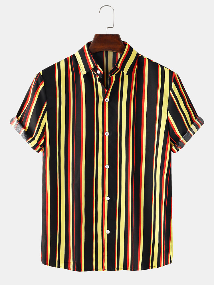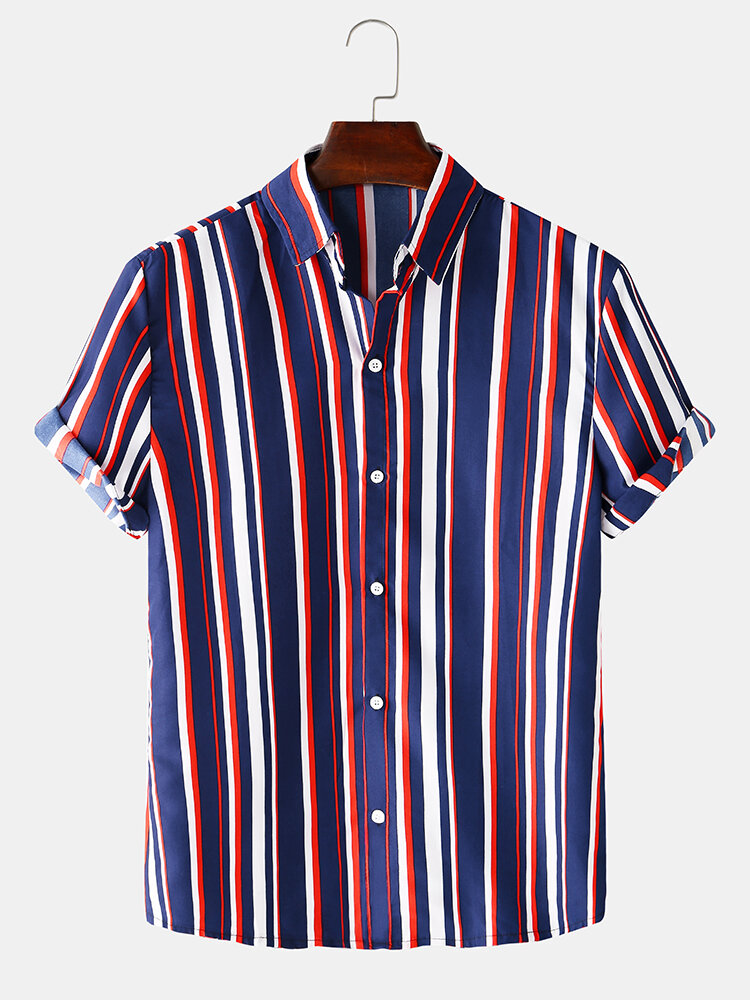 Description:Fit Type:Regular FitMaterial:VinylonNeckline:LapelPattern Type:StripedScene:Leisure,Home,Business,CasualSeason:SummerSize:L,S,XL,MSleeve:Short SleeveStyle:Casual,Hawaii Style