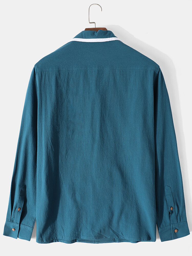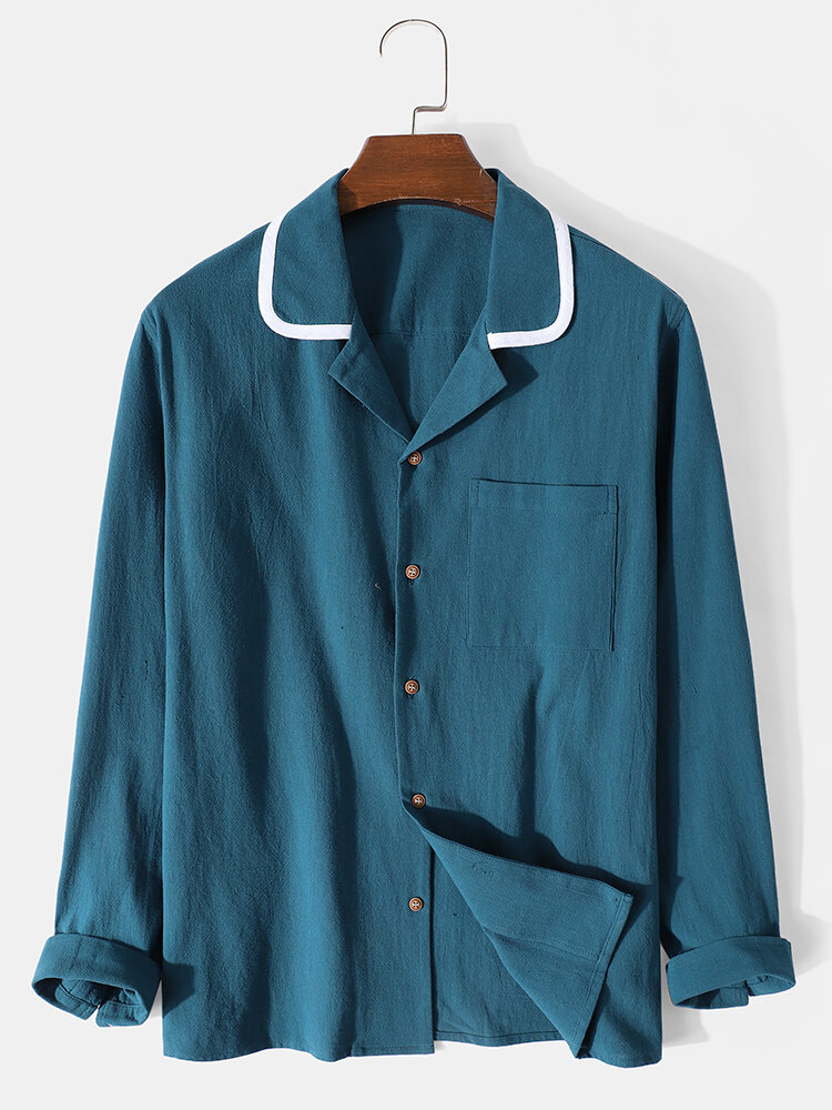 Mens Contrast Binding Revere Collar 100% Cotton Long Sleeve Shirts – Lake Blue S