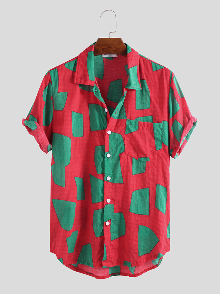Mens Contrast Color Blocks Summer Fashion Printing Shirts – 3XL Red
