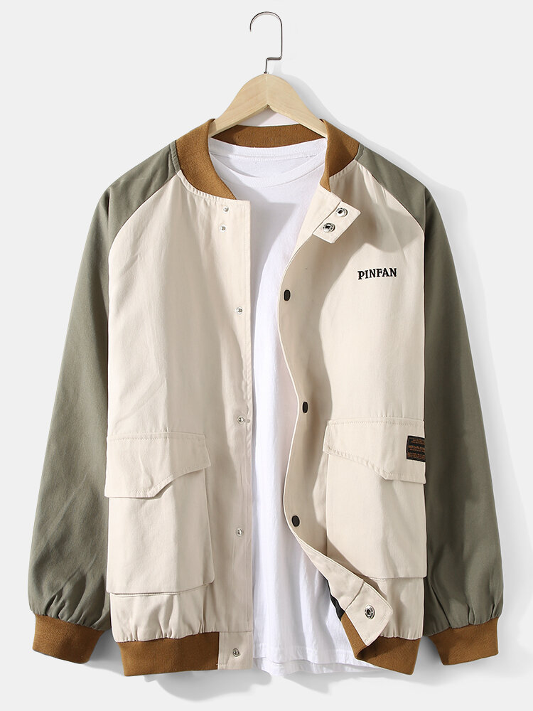 Mens Contrast Patchwork Applique Cotton Baseball Collar Casual Jackets With Snap-Button – Apricot S