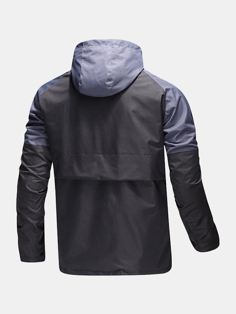 Mens Contrast Patchwork Zip Front Waterproof Drawstring Cuff Hooded Outdoors Jackets – Black L