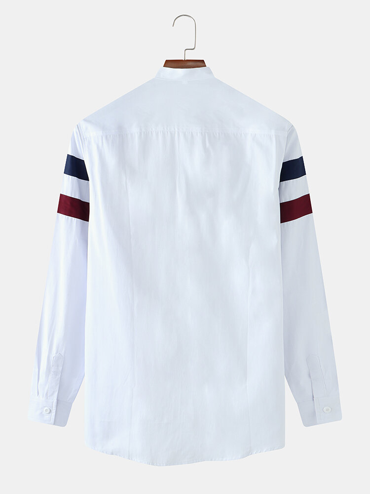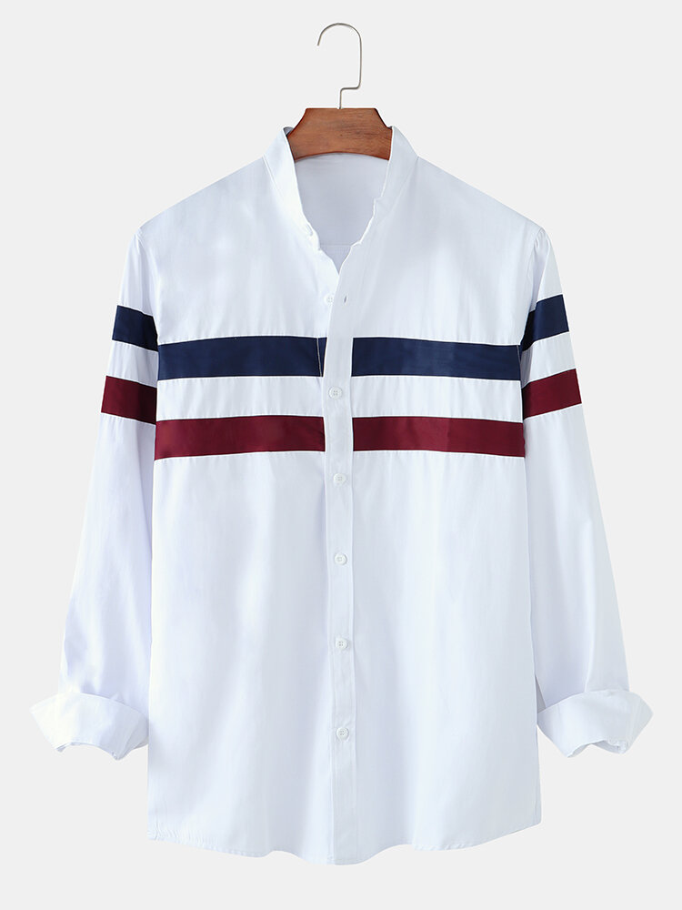 Mens Contrast Striped Stand Collar Button Long Sleeve Casual Shirt – White L