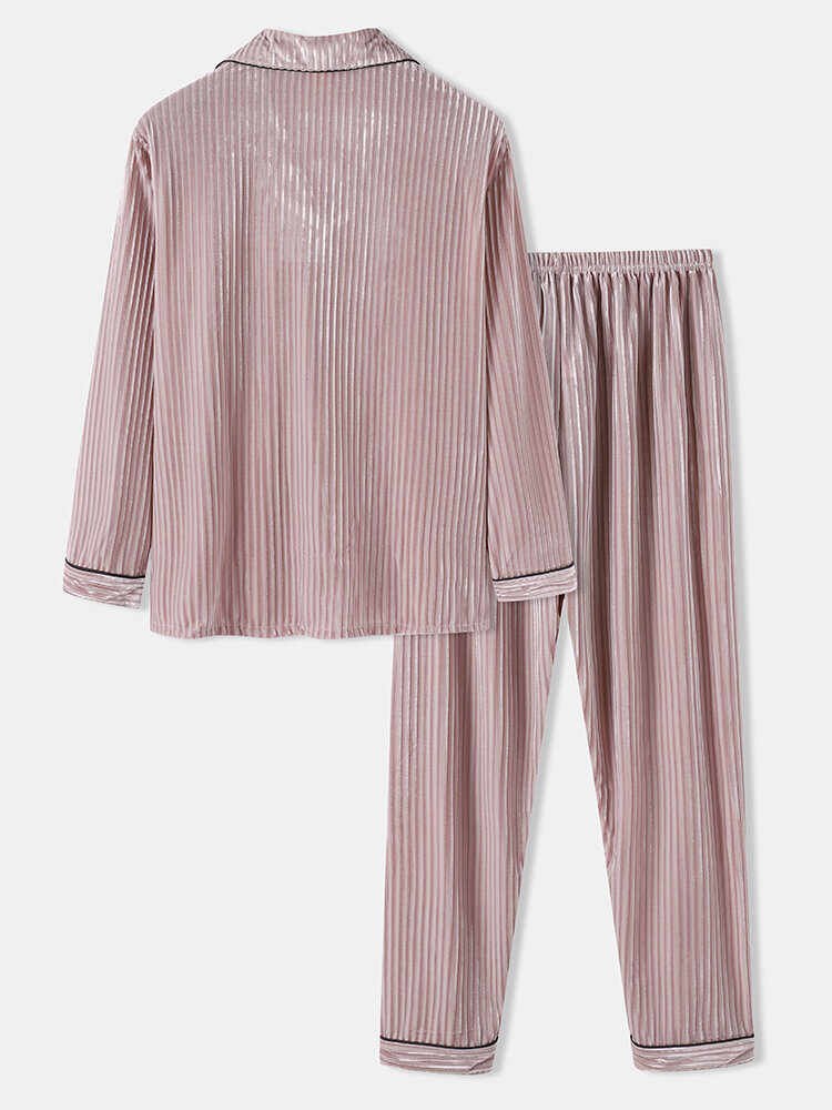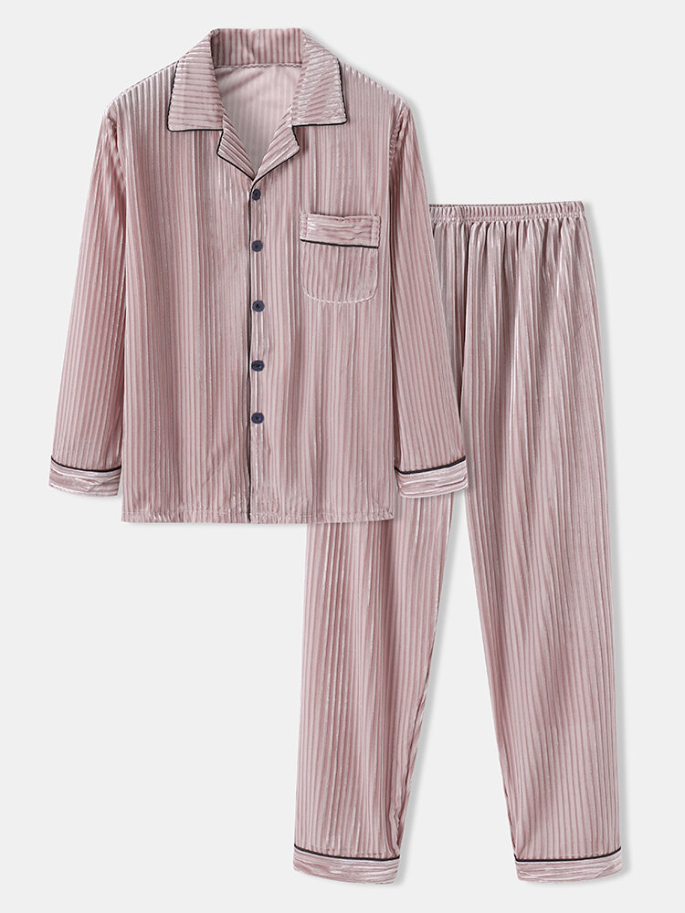 Mens Coral Fleece Lapel Button Up Long Sleeve Loose Pants Two-Piece Home Warm Pajamas Set – M Pink