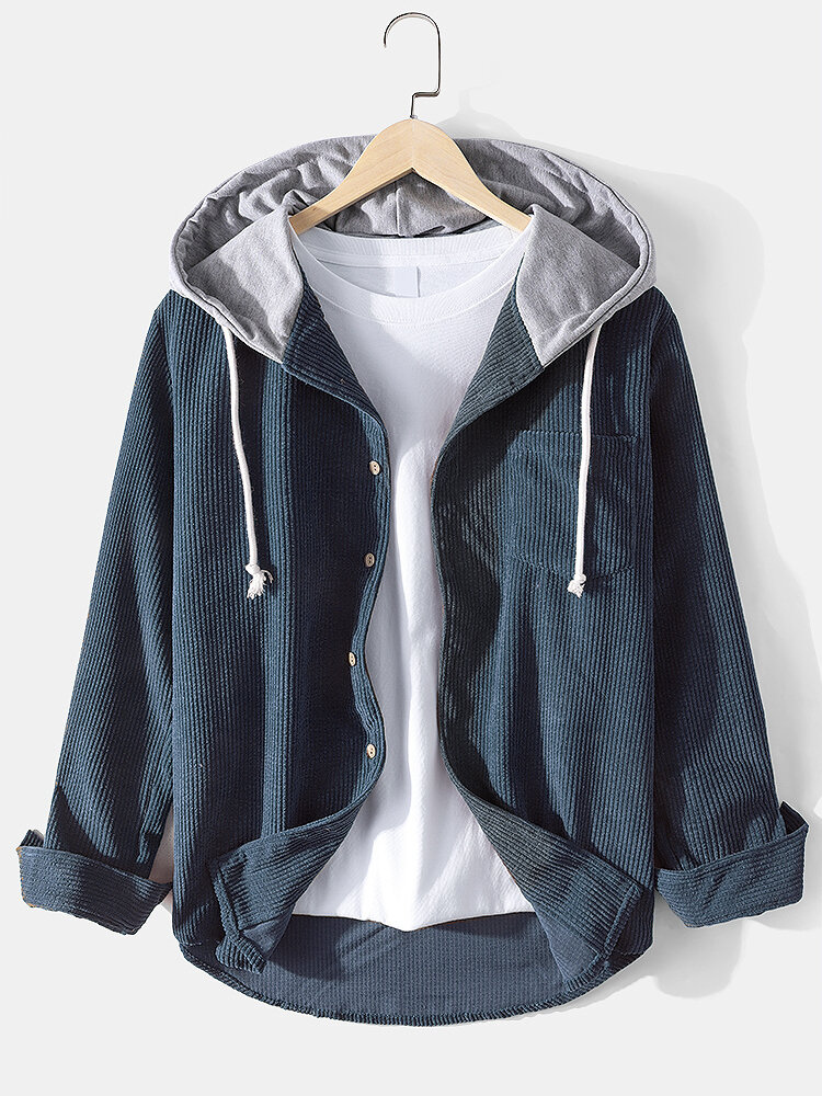 Mens Corduroy Casual Long Sleeve Drawstring Hooded Shirts With Pocket – S Navy