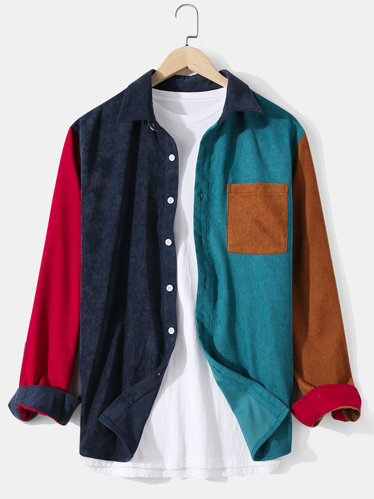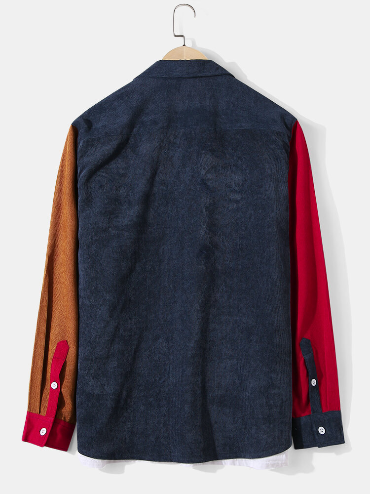 Mens Corduroy Color Block Patchwork Lapel Pocket Long Sleeve Shirts – Blue S