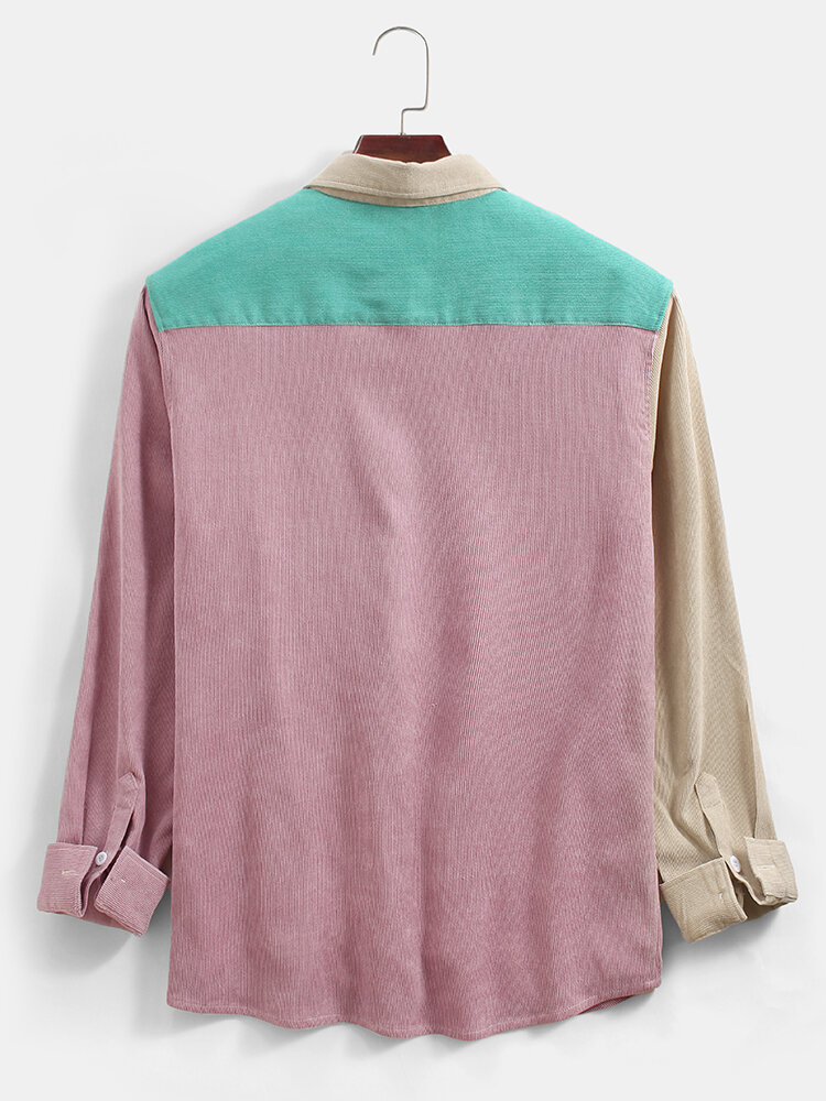 Mens Corduroy Colorblock Patchwork Casual Long Sleeve Shirts With Pocket – Green S
