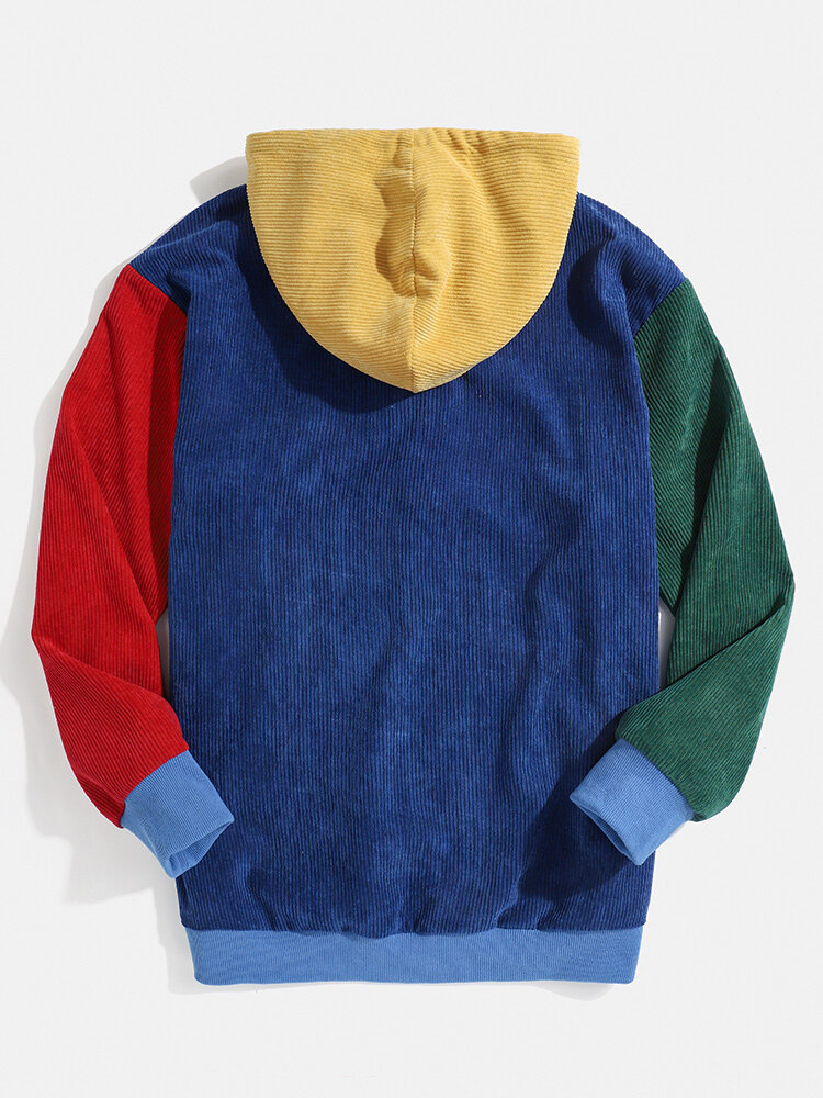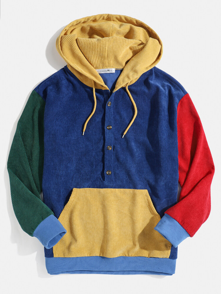 Mens Corduroy Colorblock Patchwork Half Button Pouch Pocket Drawstring Hoodies – S Blue