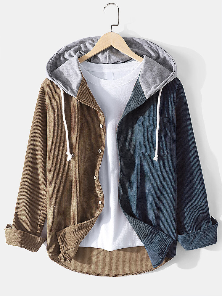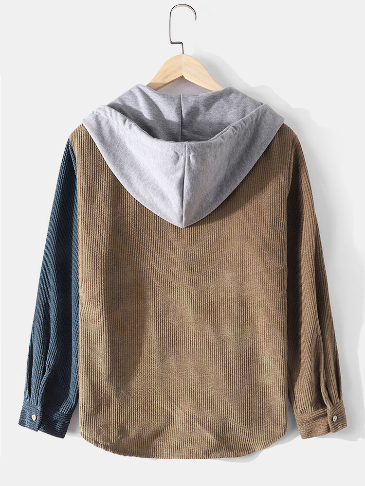 Mens Corduroy Contrast Patchwork Casual Long Sleeve Drawstring Hooded Shirts – 2XL Khaki