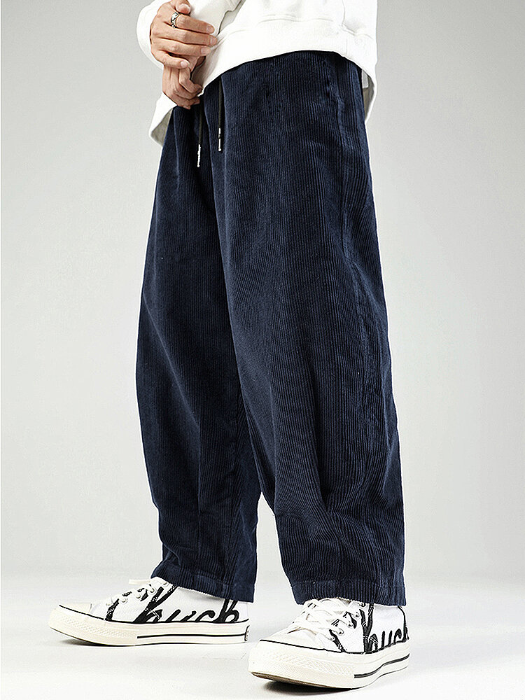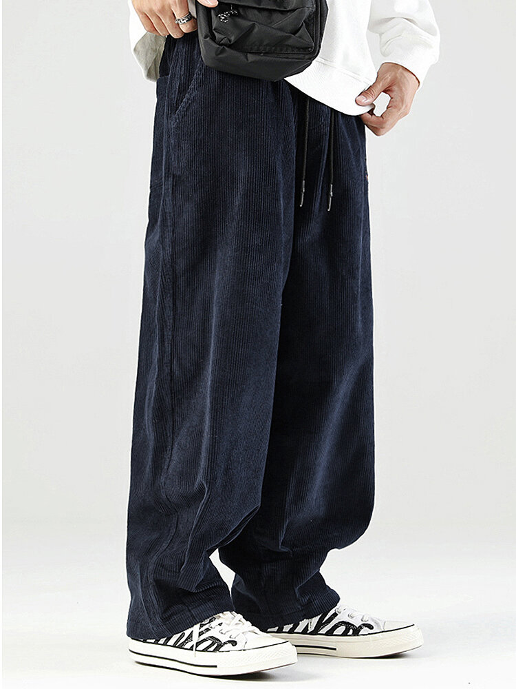 Mens Corduroy Drawstring Casual Wide Leg Pants With Pocket – Navy S