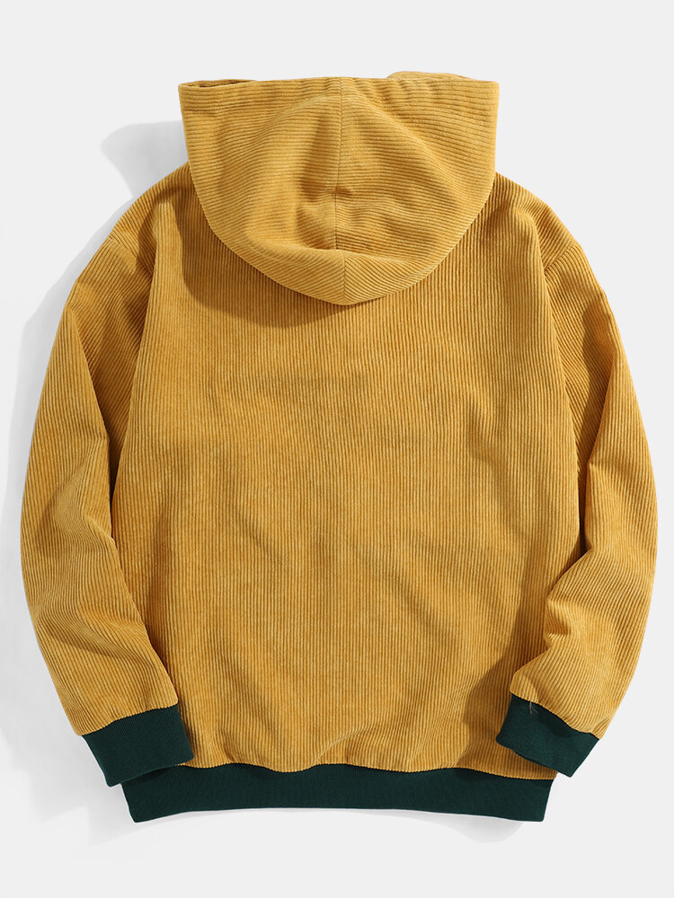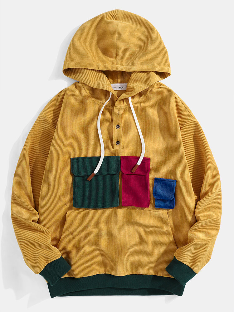 Mens Corduroy Half Button Casual Drawstring Hoodies With Patched Pocket – Yellow S