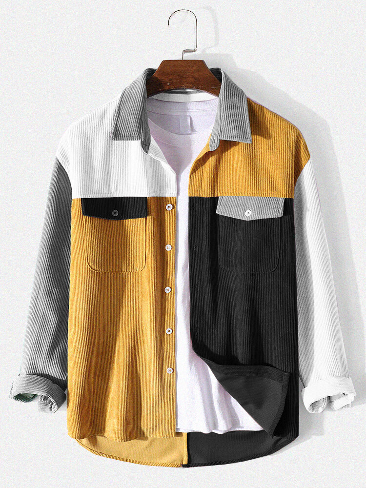 Mens Corduroy Panel Patchwork Button Up Casual Long Sleeve Shirts – Yellow S