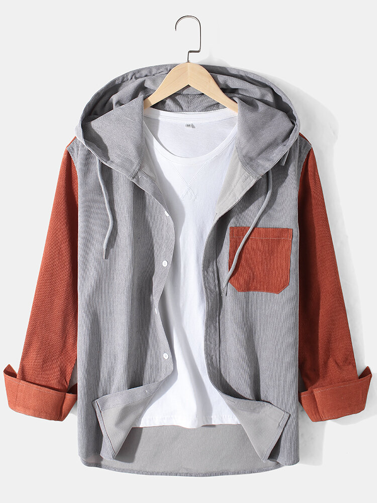 Mens Corduroy Patchwork Chest Pocket Long Sleeve Casual Hooded Shirts – Grey S