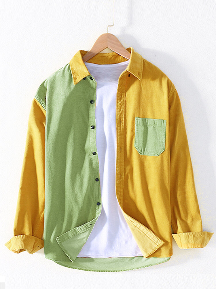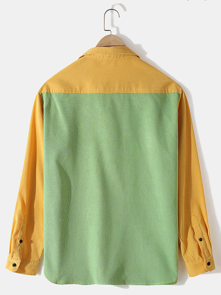 Mens Corduroy Patchwork Colorblock Lapel Curved Hem Shirts With Pocket – Green S
