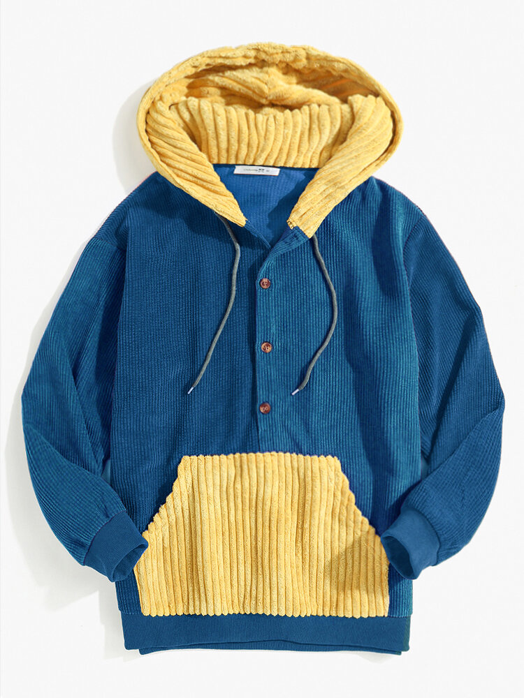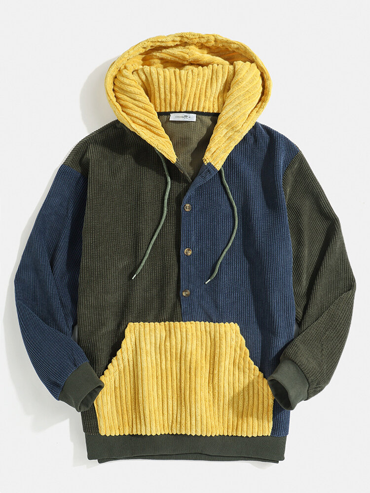 Mens Corduroy Patchwork Half Button Kangaroo Pocket Drawstring Hoodies – Army Green S