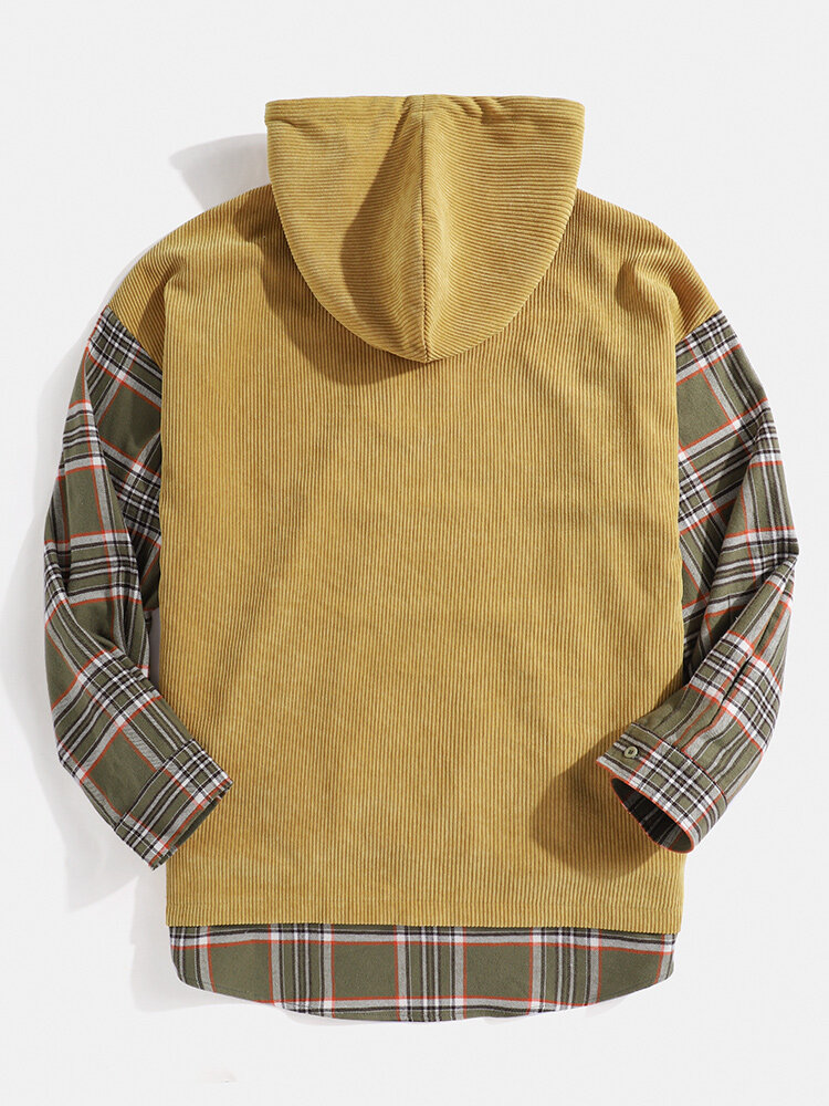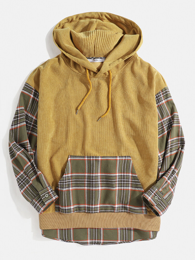 Mens Corduroy Patchwork Plaid Kangaroo Pocket High-low Hem Hoodies – S Yellow