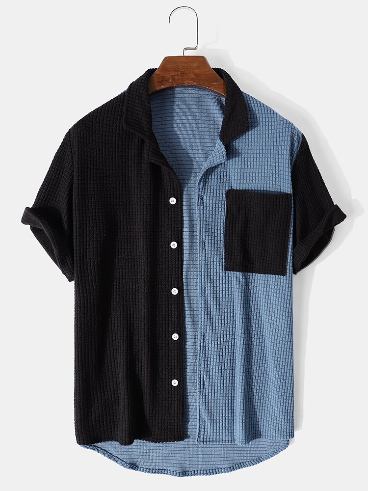 Mens Corduroy Patchwork Pocket Lapel Short Sleeve Shirt – Blue S