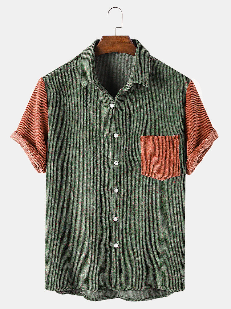 Mens Corduroy Patchwork Turn Down Collar Short Sleeve Shirts – Army Green S