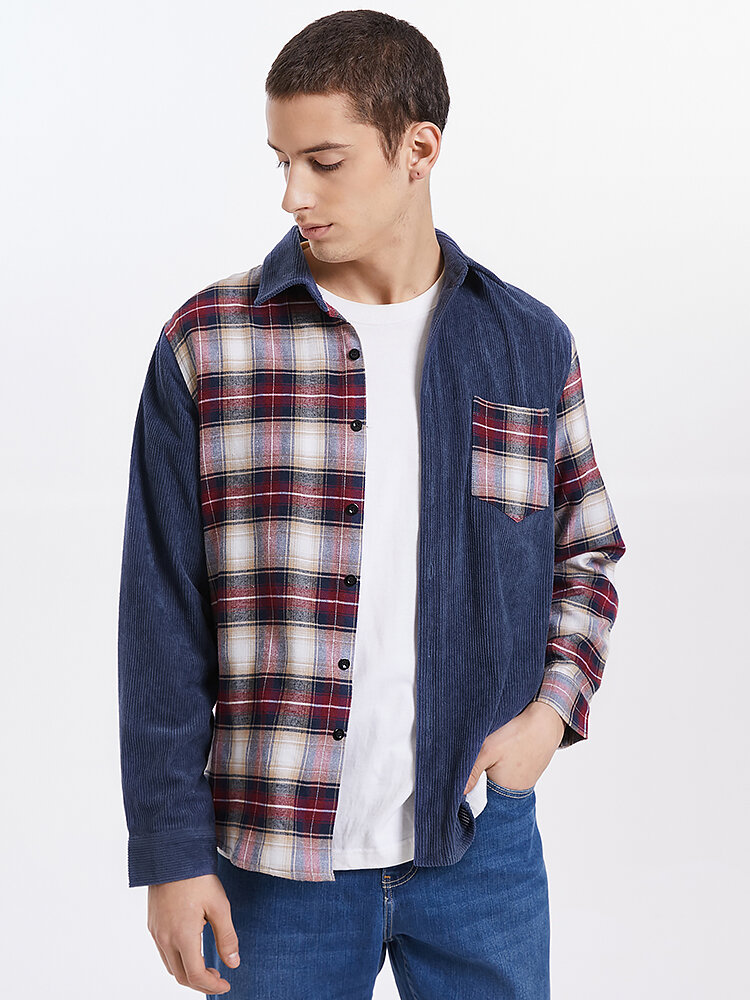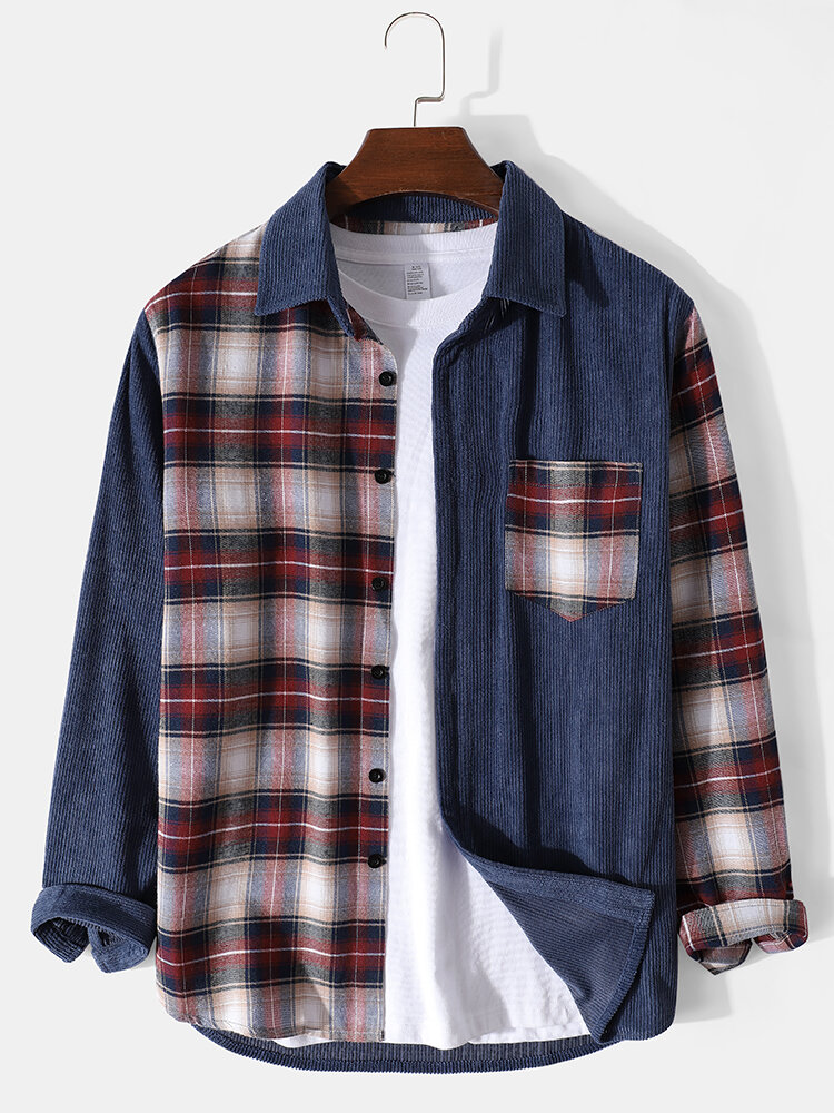 Mens Corduroy Plaid Spliced Lapel Button Up Long Sleeve Shirts – Blue S