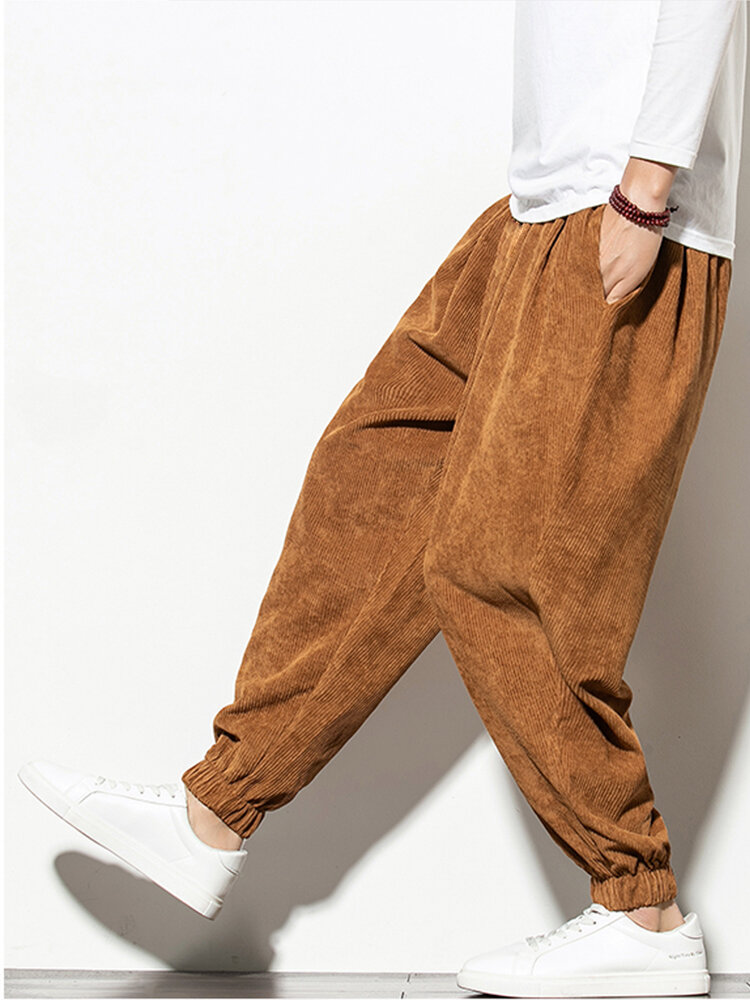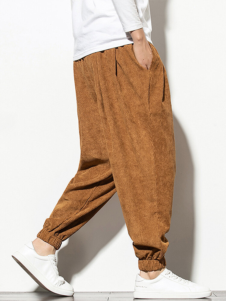 Mens Corduroy Solid Color Drawstring Mid Waist Elastic Cuff Jogger Pants – Blue S