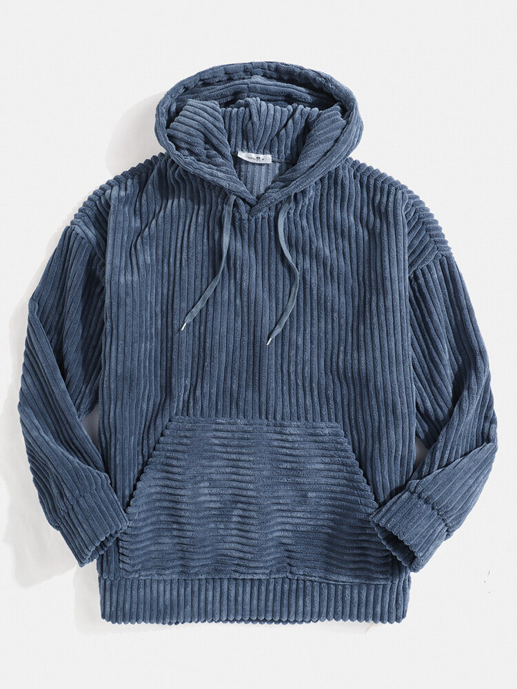 Mens Corduroy Solid Color Kangaroo Pocket Drop Shoulder Hoodies – Blue S