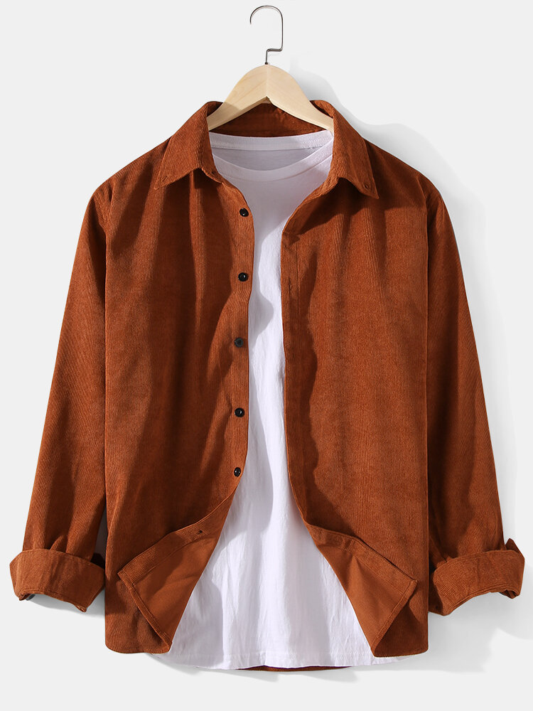 Mens Corduroy Solid Color Lapel Long Sleeve Simple Shirts – Brown S