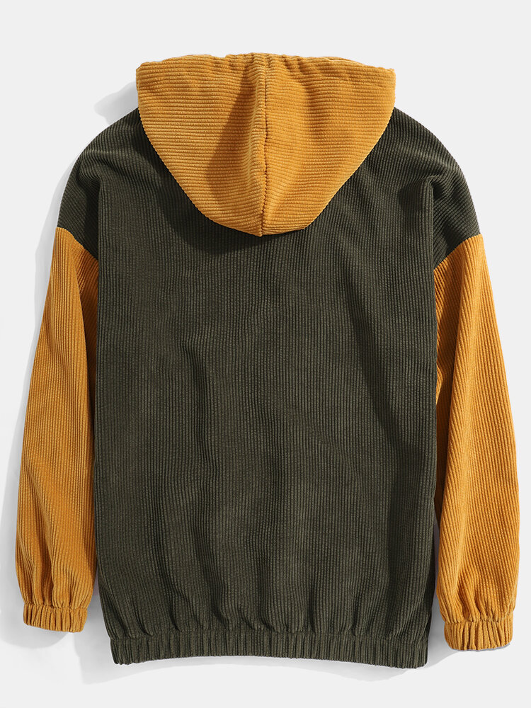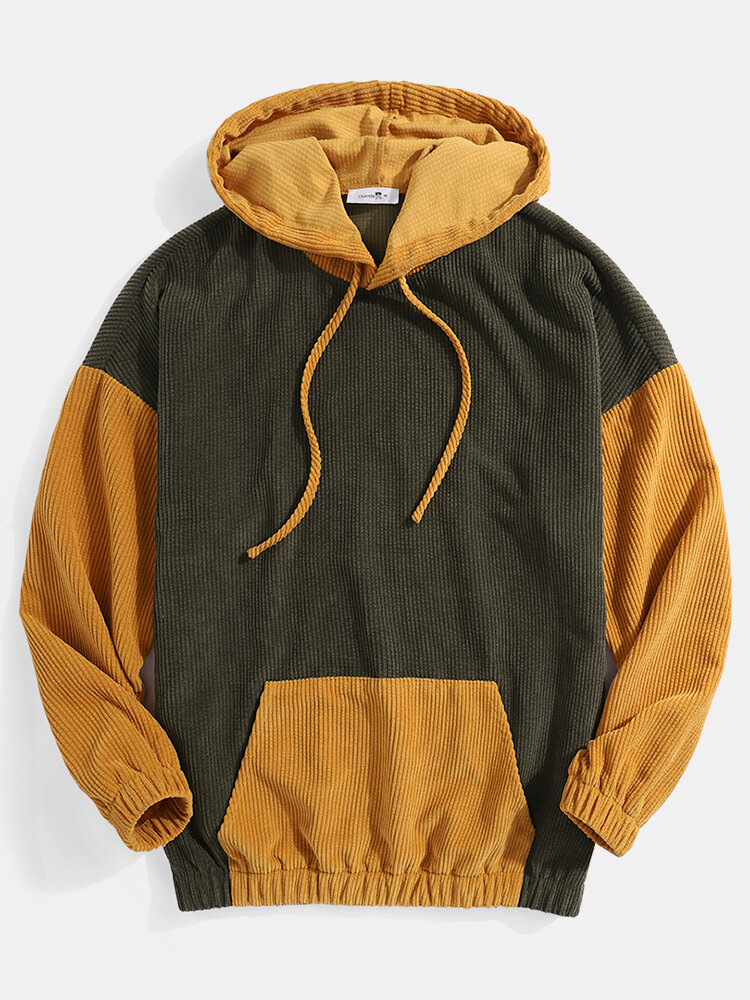 Mens Corduroy Solid Color Patchwork Drop Shoulder Kangaroo Pocket Casual Hoodies – Army Green S