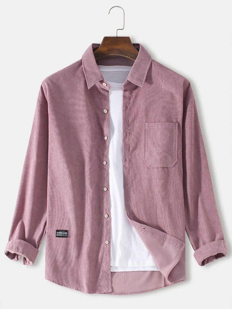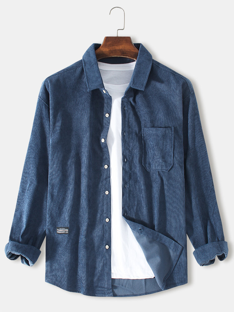 Mens Corduroy Solid Turn Down Collar Long Sleeve Shirts – Blue S