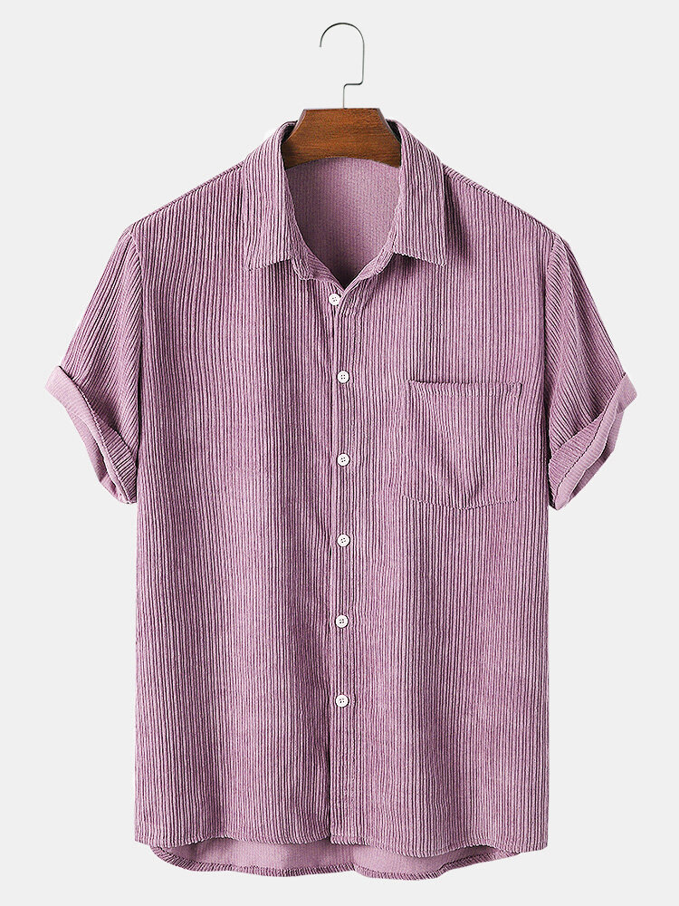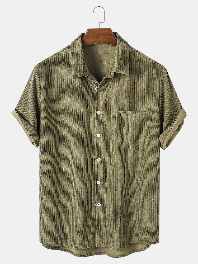 Mens Corduroy Solid Turn Down Collar Short Sleeve Shirts – Army Green S