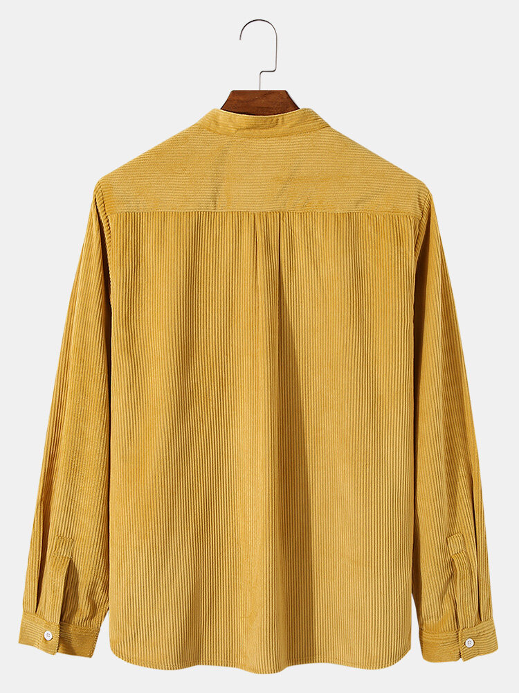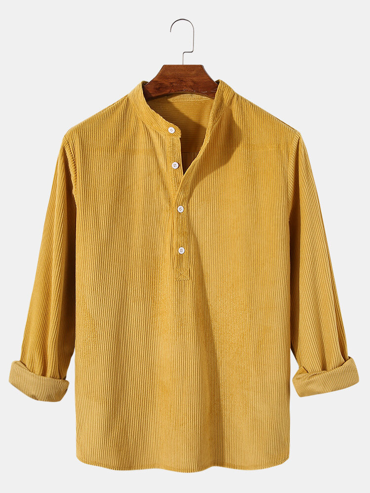 Mens Corduroy Stand Collar Plain Long Sleeve Henley Shirts – Yellow S