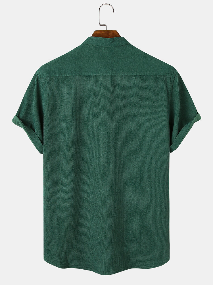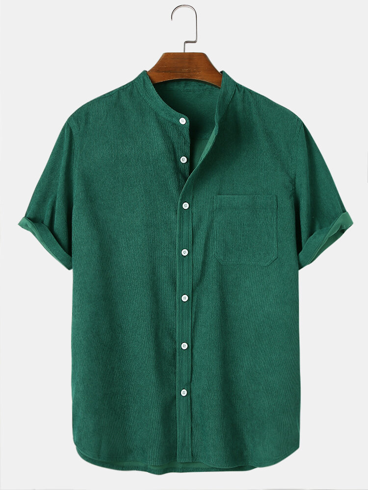 Mens Corduroy Stand Collar Solid Button Up Short Sleeve Shirts With Pocket – Green M