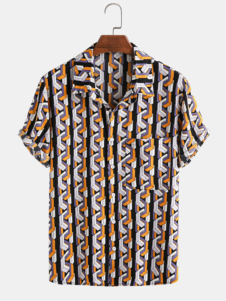 Mens Cotton Abstract 3D Geometric Print Casual Short Sleeve Shirt – Red M