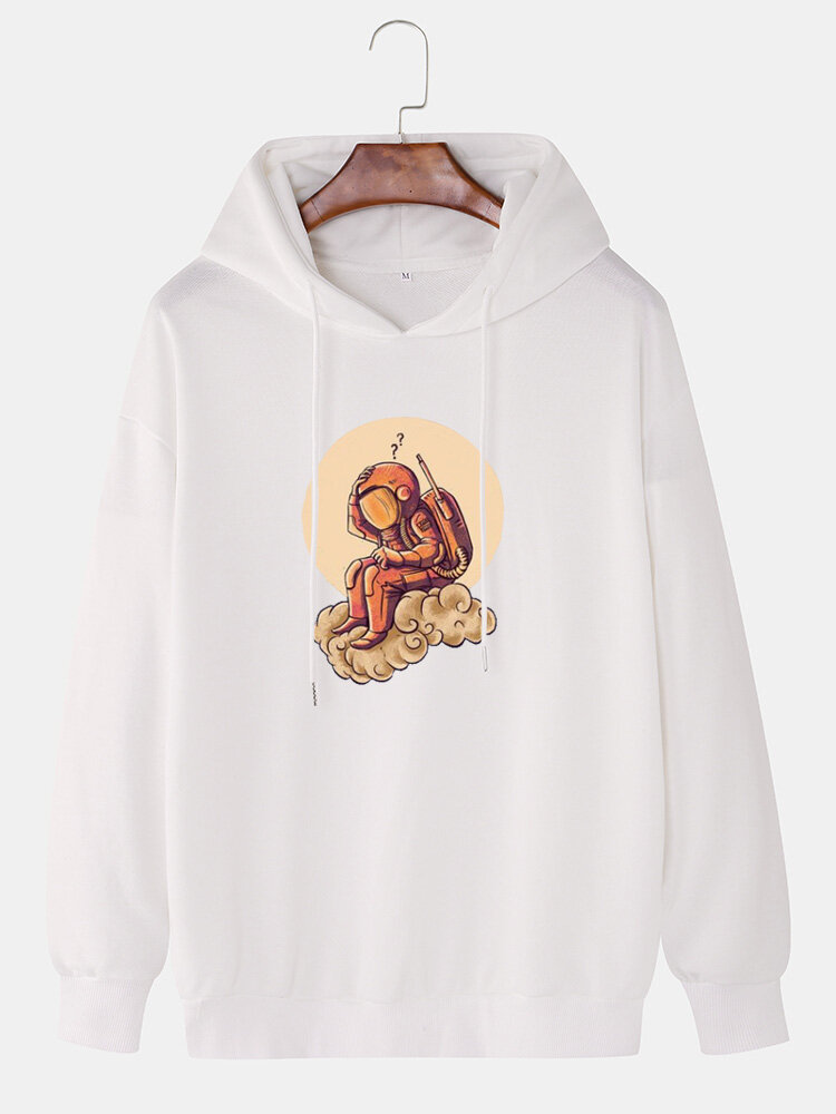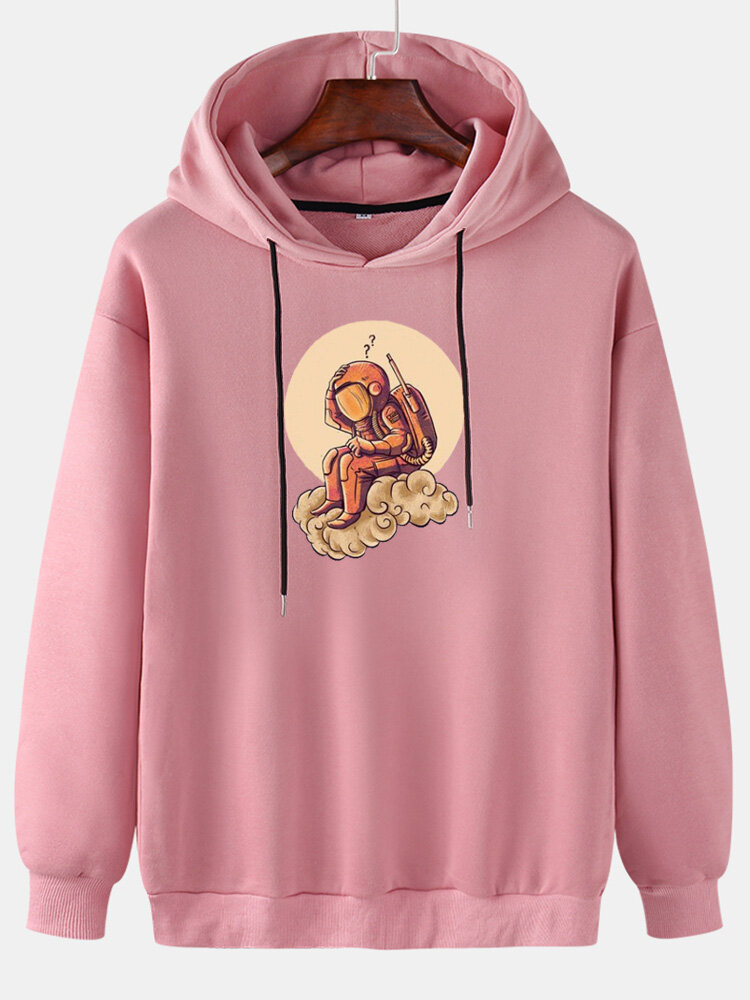 Mens Cotton Cartoon Astronaut Print Long Sleeve Drop Shoulder Drawstring Hoodies – Black S