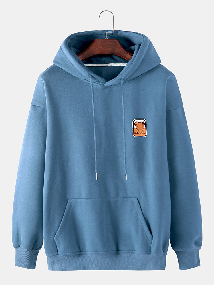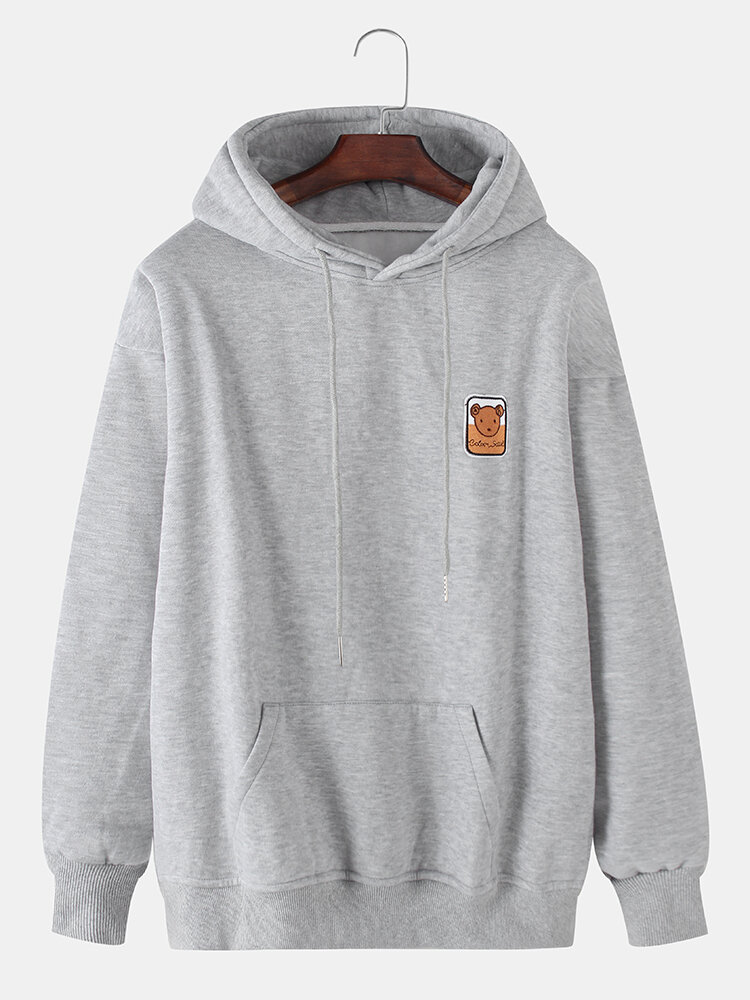 Mens Cotton Cartoon Bear Embroidery Drop Shoulder Long Sleeve Casual Hoodies – Grey S