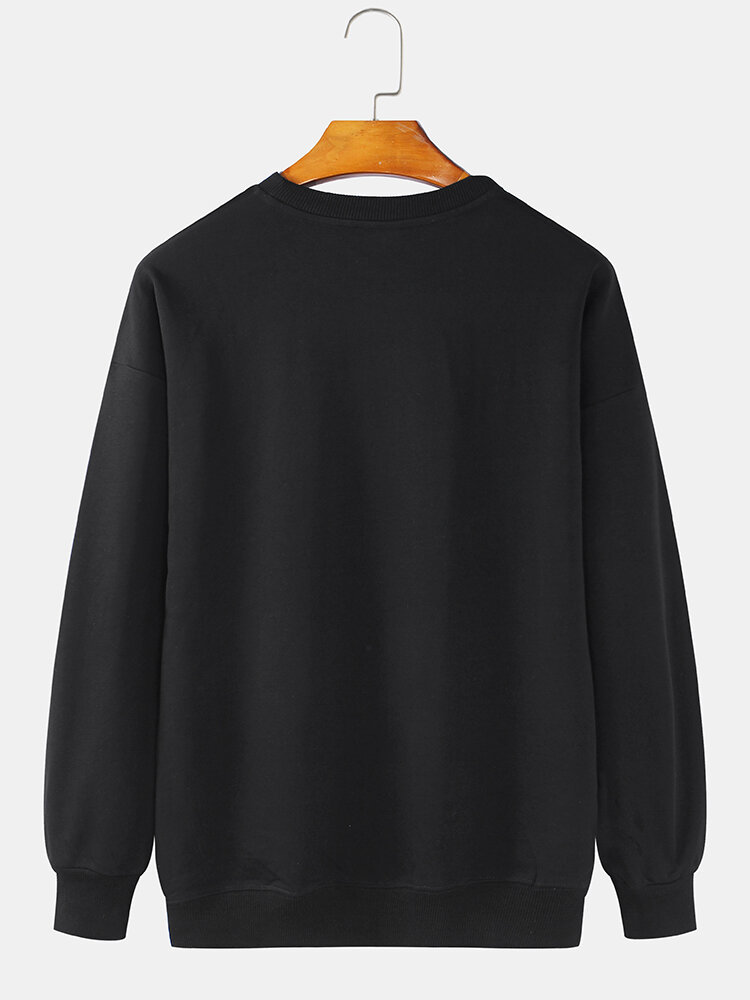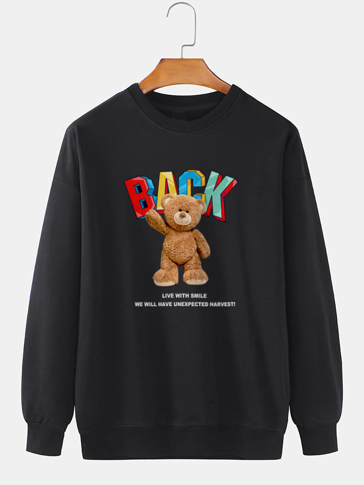 Mens Cotton Cartoon Bear & Letter Print Pullover Long Sleeve Casual Sweatshirts – Black L