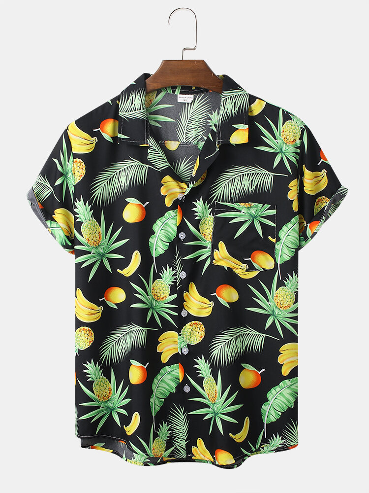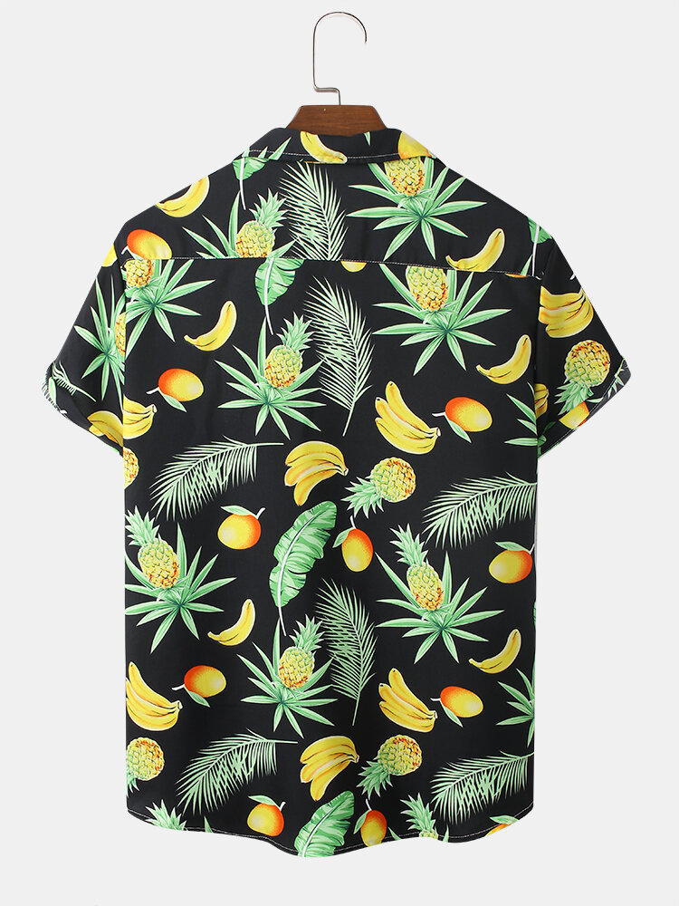 Mens Cotton Cartoon Fruit Print Revere Collar Short Sleeve Shirt – Green XL