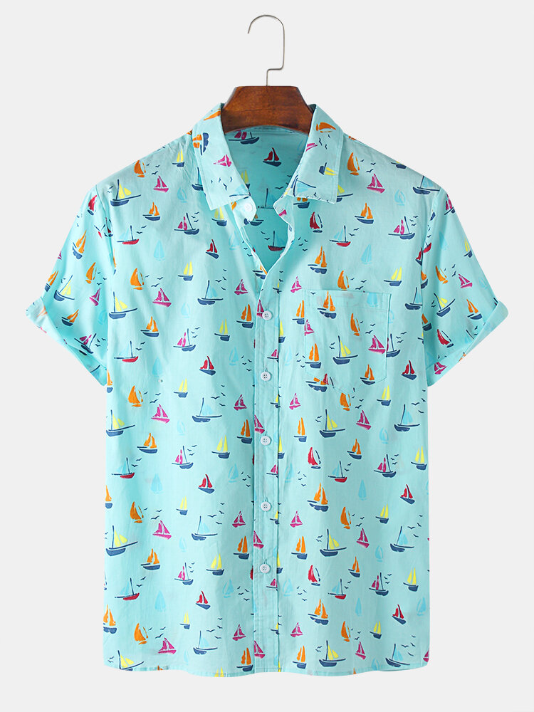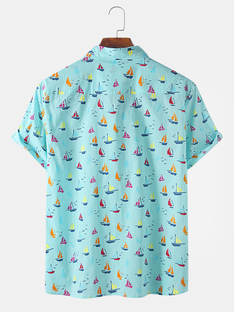 Mens Cotton Cartoon Sailboat Printed Button Up Hawaii Beach Short Sleeve Shirts – Blue 2XL