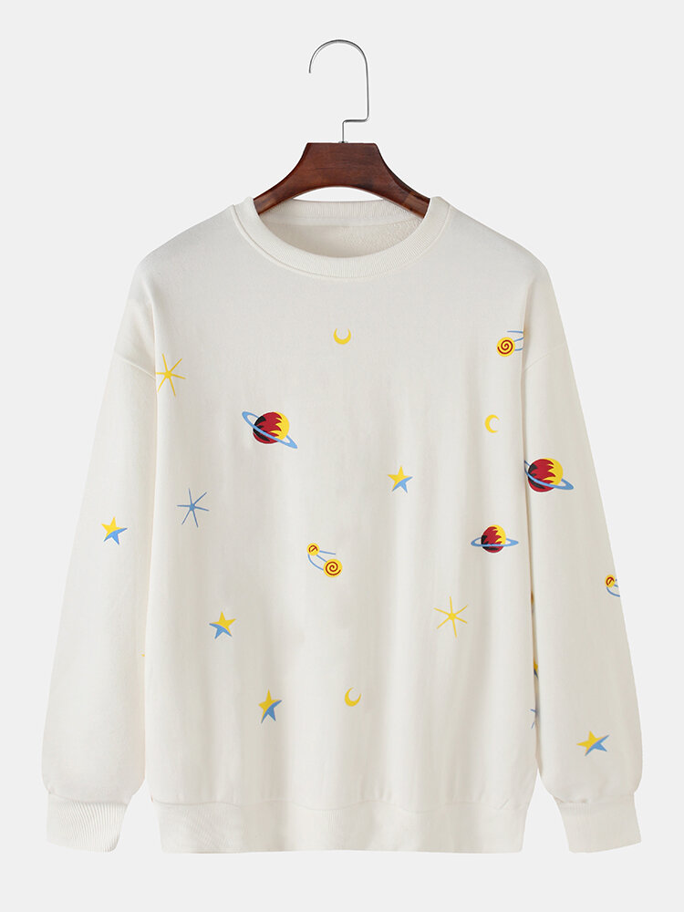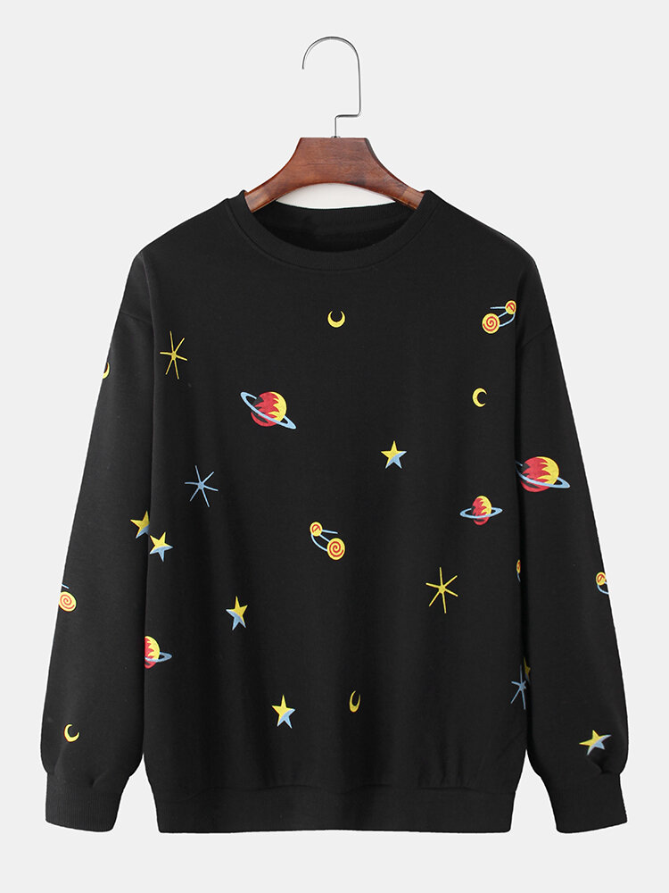 Mens Cotton Cartoon Star & Planet Print Pullover Long Sleeve Simple Sweatshirts – Black XL