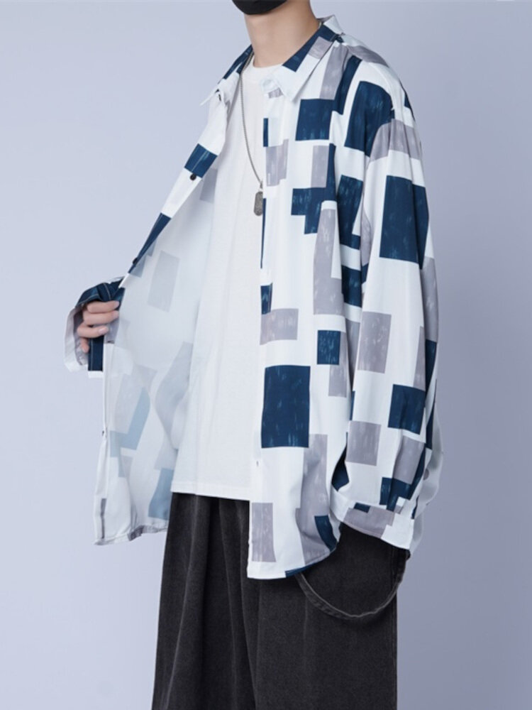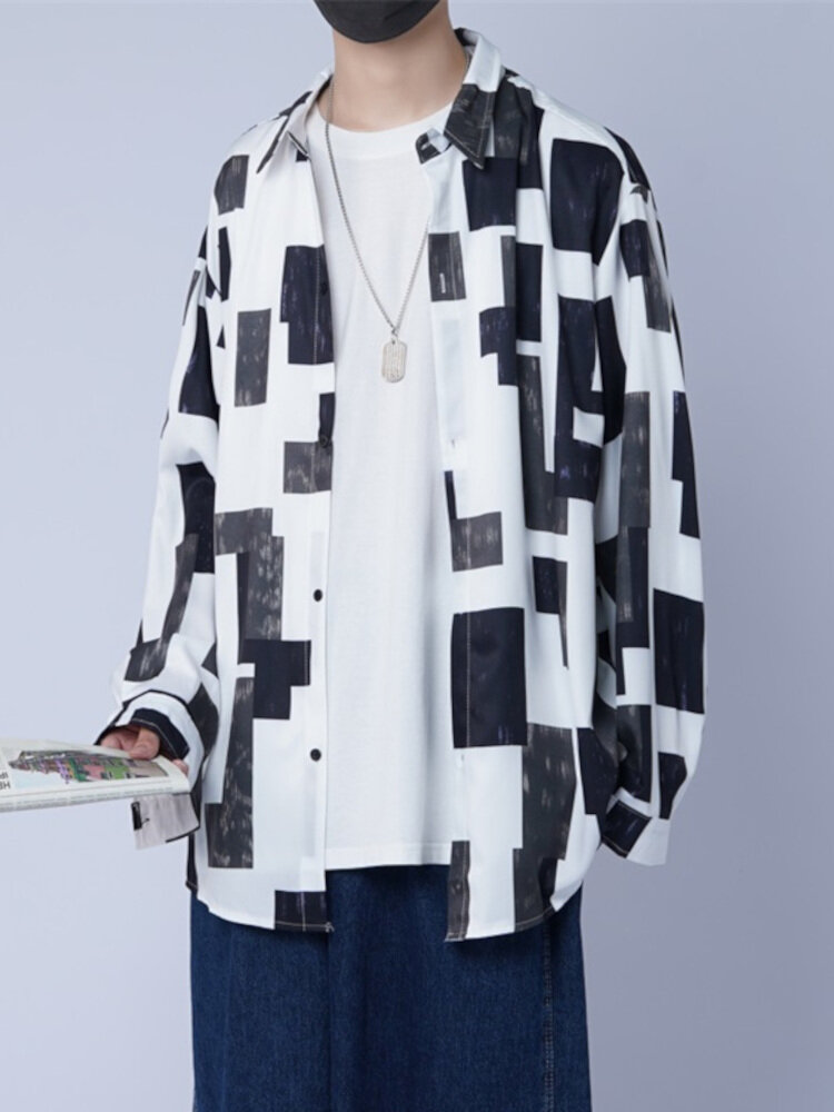 Mens Cotton Color Block Lapel Geometric Casual Shirt – Black 2XL