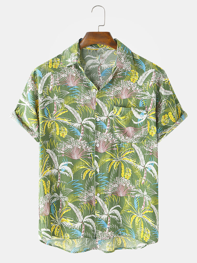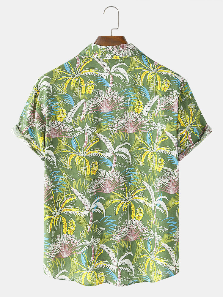 Mens Cotton Colorful Coconut Tree Print Holiday Beach Short Sleeve Shirts – Green XL