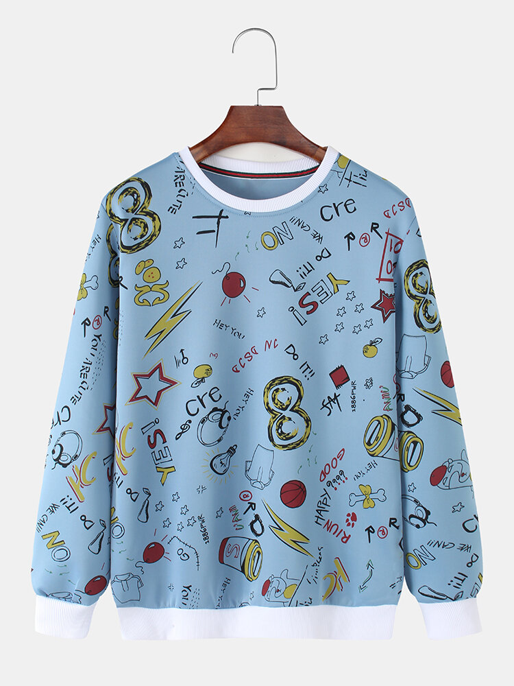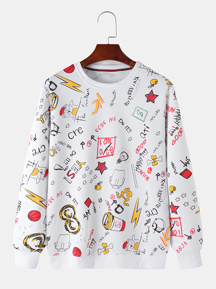 Mens Cotton Cute Graffiti Print Pullover Round Neck Long Sleeve Casual Sweatshirts – White M