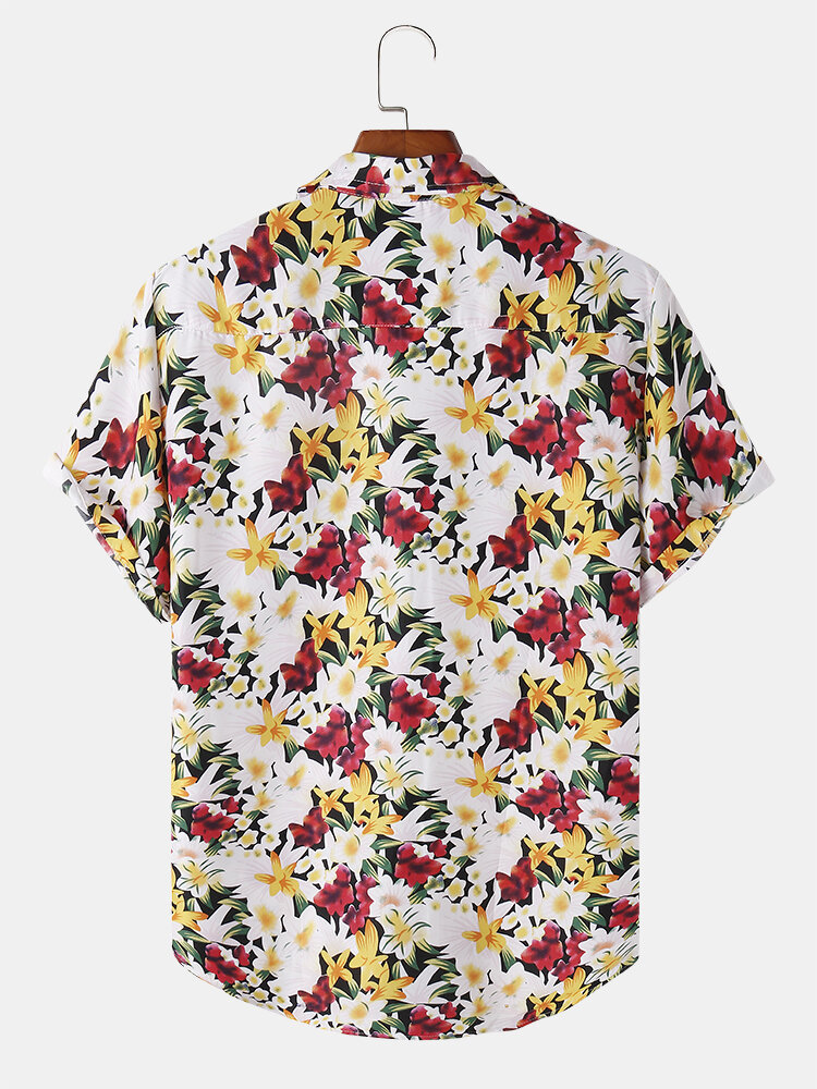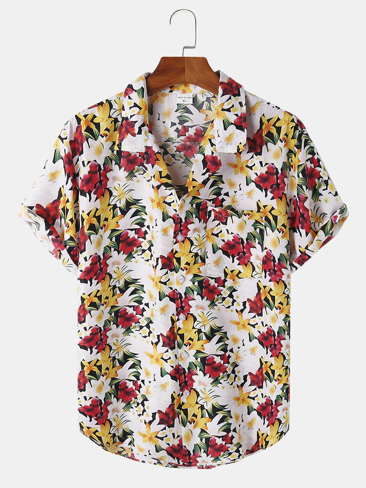 Mens Cotton Flower Print Revere Collar Short Sleeve Shirt – Red S