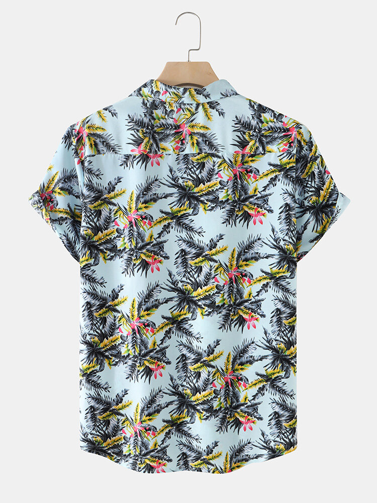 Mens Cotton Leaf Print Revere Collar Short Sleeve Shirt – White S