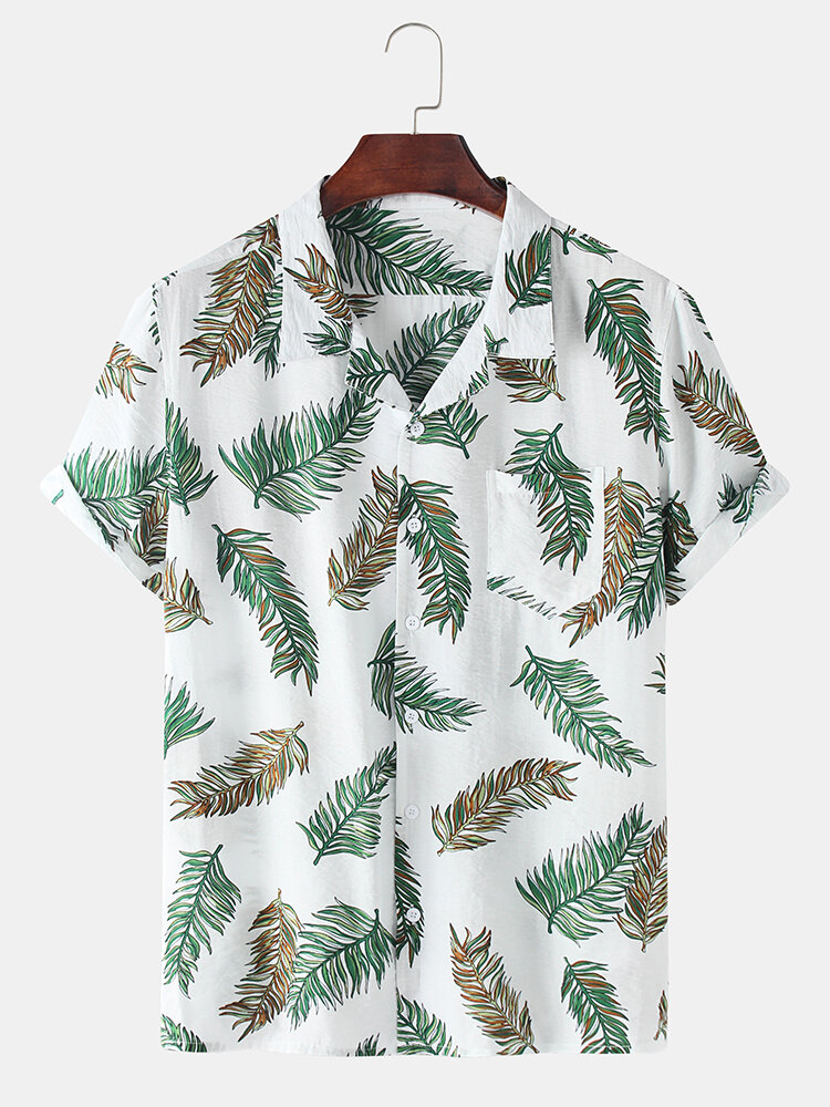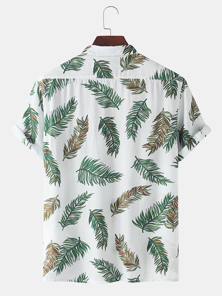 Mens Cotton Leaves Print Revere Collar Short Sleeve Shirts – White M